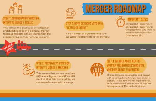 Our congregational meeting and vote on the intent to merge will be this Sunday, February 22nd. To be clear, this vote does not guarantee the merger will proceed, as that is ultimately up to the Presbytery. But we will vote on an intent to merge, provided that all due diligence, legal, corporate, and Presbytery requirements are met. We have until the end of May to complete our due diligence and fulfill all the requirements.